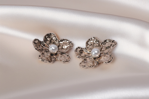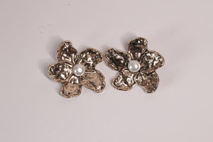 Oversized flower earrings in a hammered metallic gold finish, centered with a glossy pearl for luxe impact.