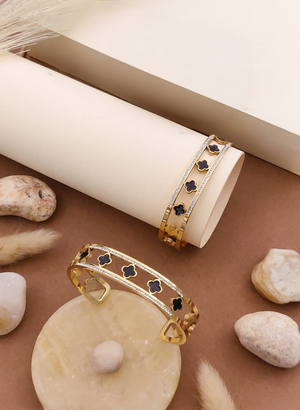 A chic gold-plated cuff bracelet featuring elegant black clover motifs bordered with sparkling American diamonds for a touch of modern luxury.