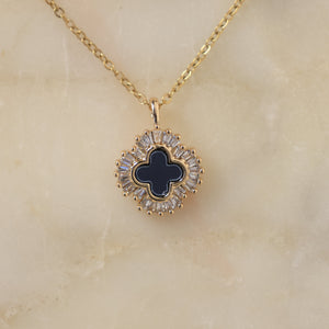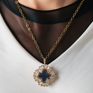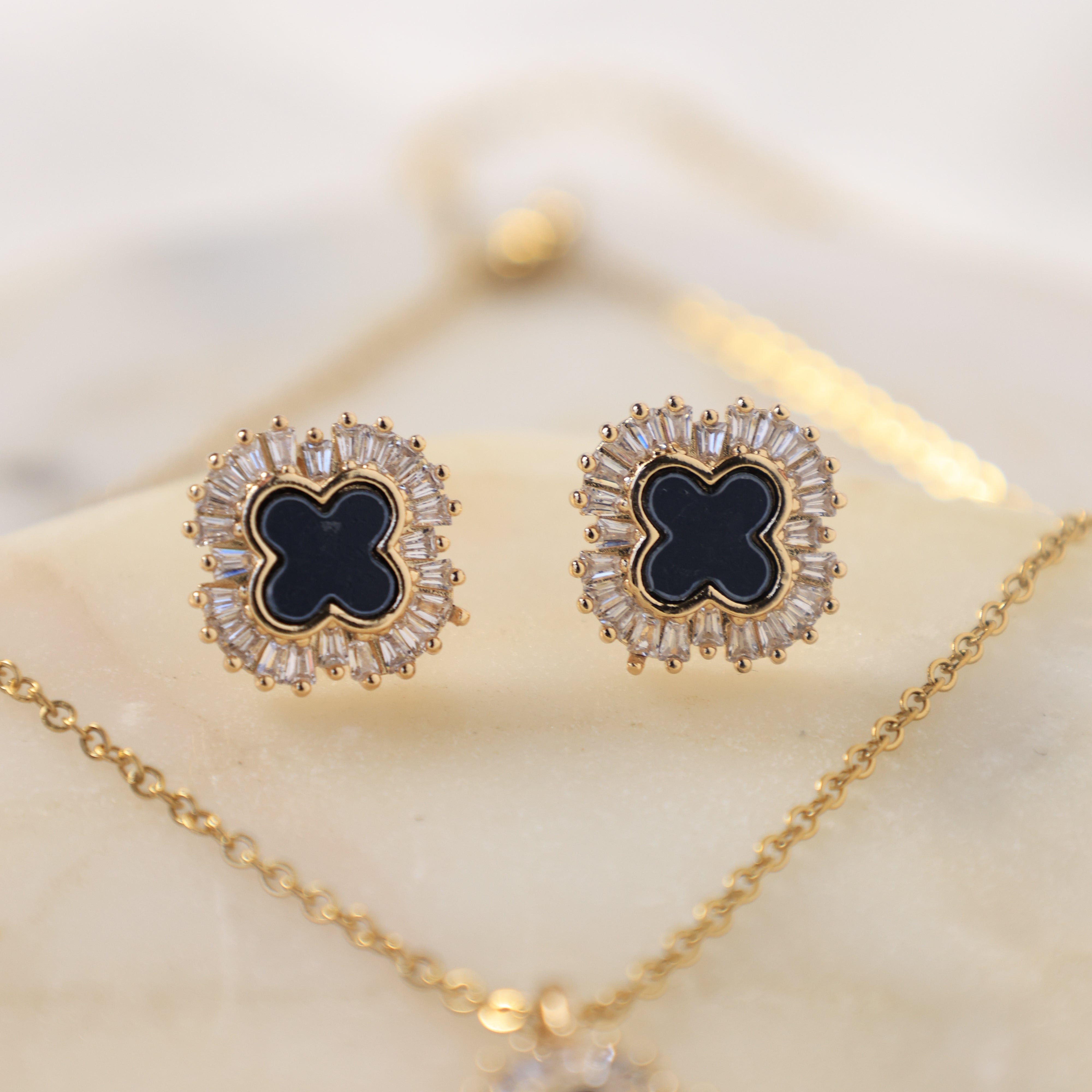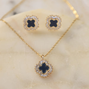 This exquisite gold-plated jewellery set showcases a floral clover design with a deep black enamel centre, encircled by radiant American diamonds that exude sophistication.