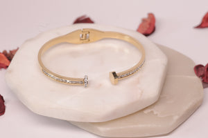 A sleek gold bracelet featuring a clean-cut open-end design, accentuated with a single line of sparkling crystals for understated elegance.