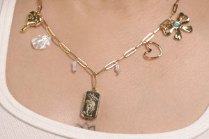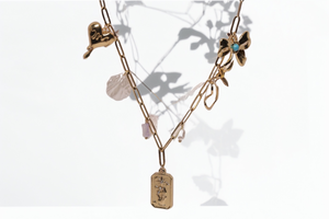 A delicate chain of sculpted charms—featuring hearts, florals, pearls, and a divine pendant—this necklace captures whimsical elegance with a youthful, artistic flair.