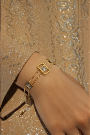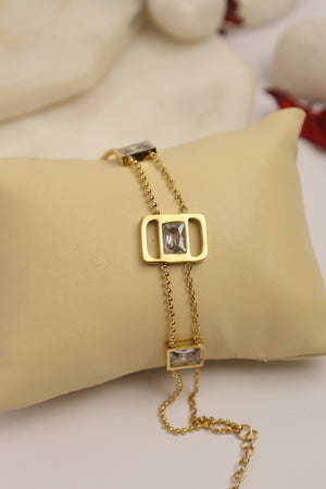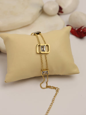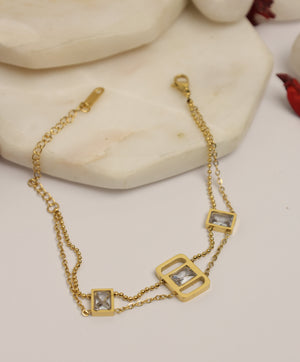 Minimalist gold-plated bracelet with geometric square charms and sparkling clear stones for everyday elegance.