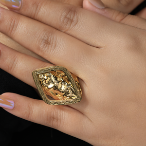Gold-plated and artistically contoured, this ring’s unique hammered texture catches the light with every movement.