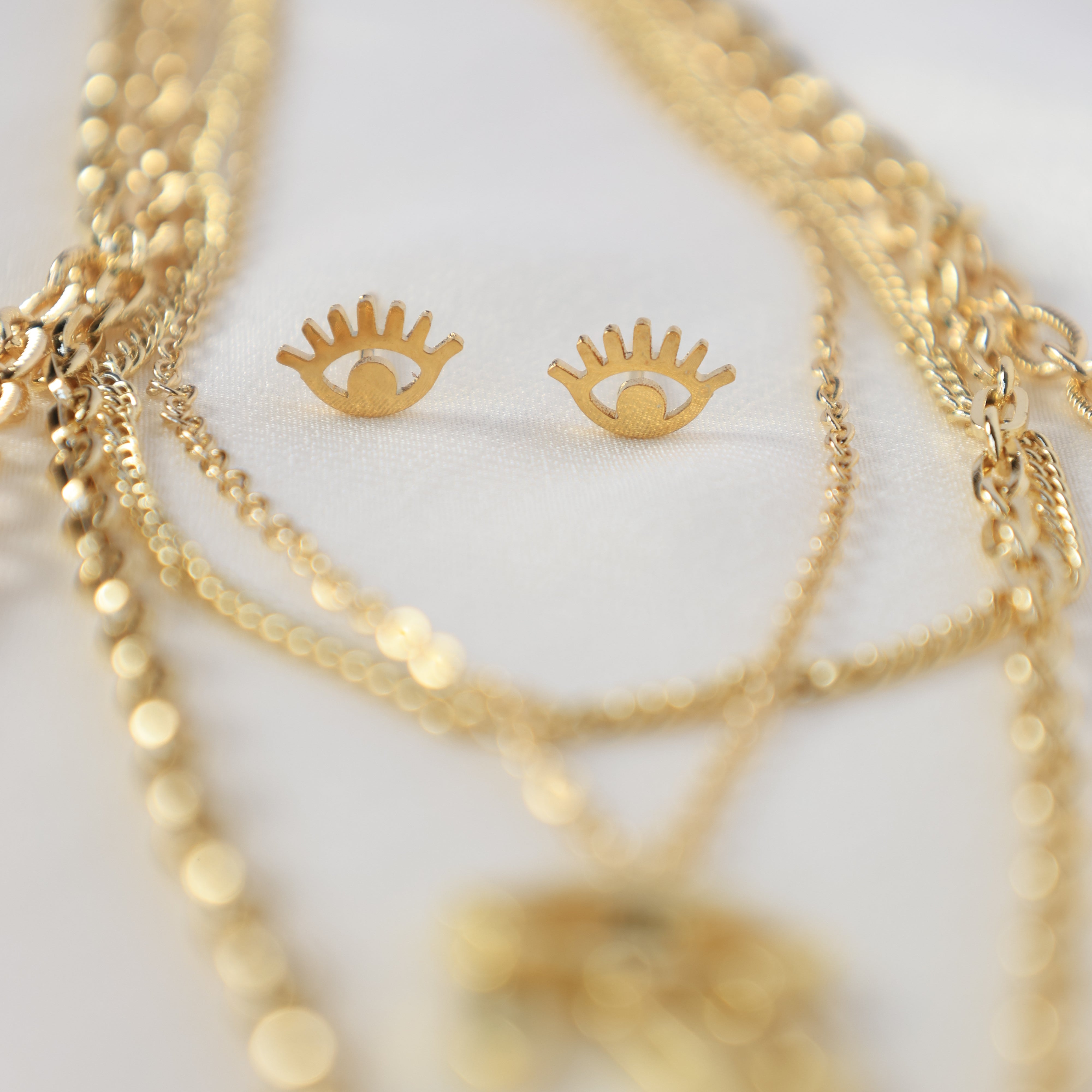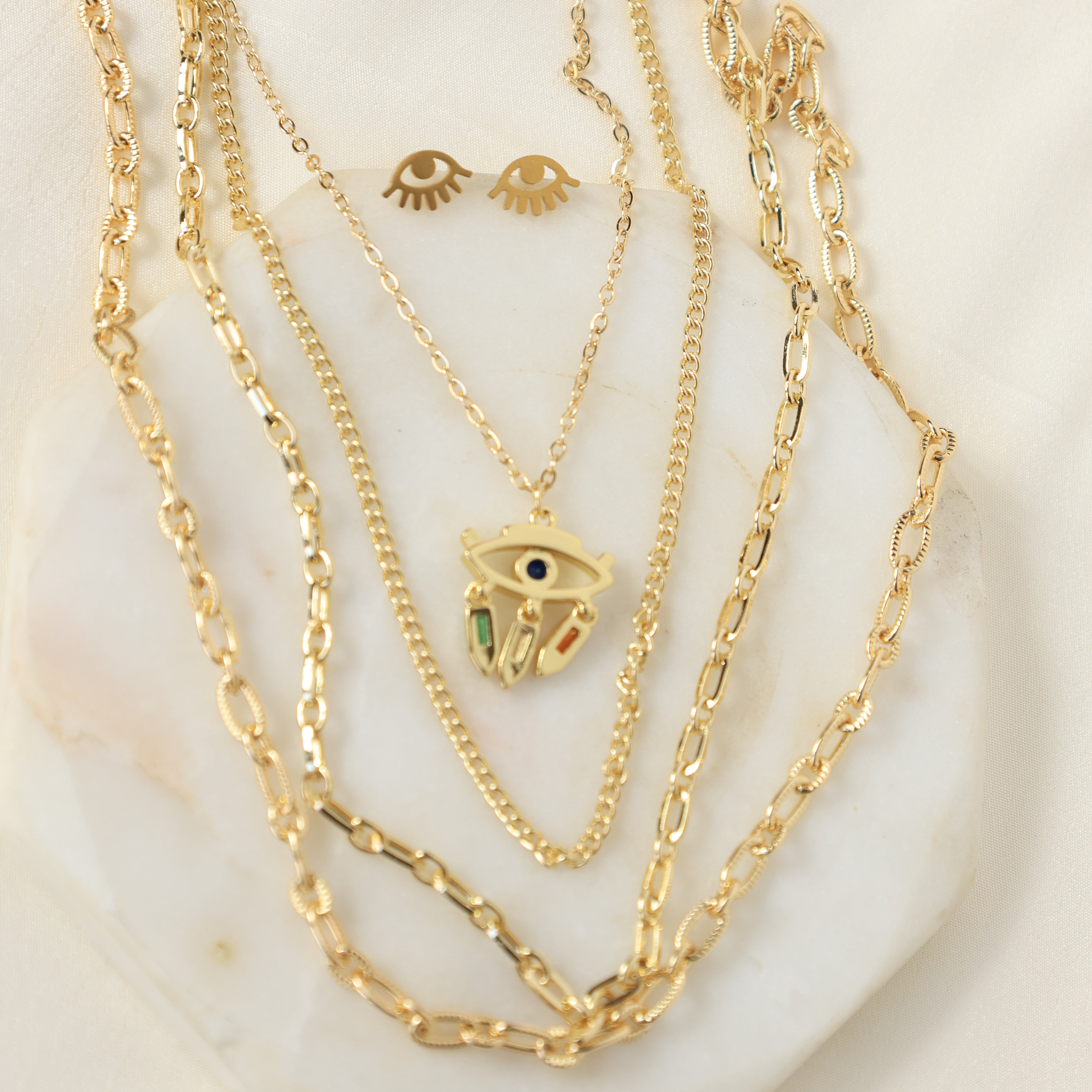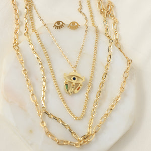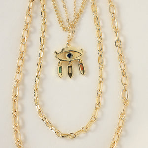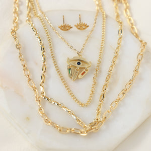 This gold-plated jewellery set features delicate layered chains and an intricately detailed Evil Eye pendant, accented with touches of green, blue, and red enamel for a celestial charm.