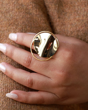 An artistic statement ring finished in rich gold plating, defined by its smooth, abstract form and high-gloss polish. Minimal yet impactful, this design celebrates modern elegance through sculptural simplicity.