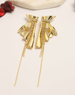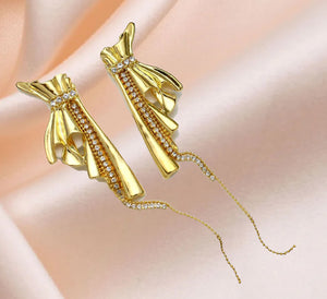 Bold gold plated bow-shaped earrings with crystal embellishments, paired with long delicate chain drops.