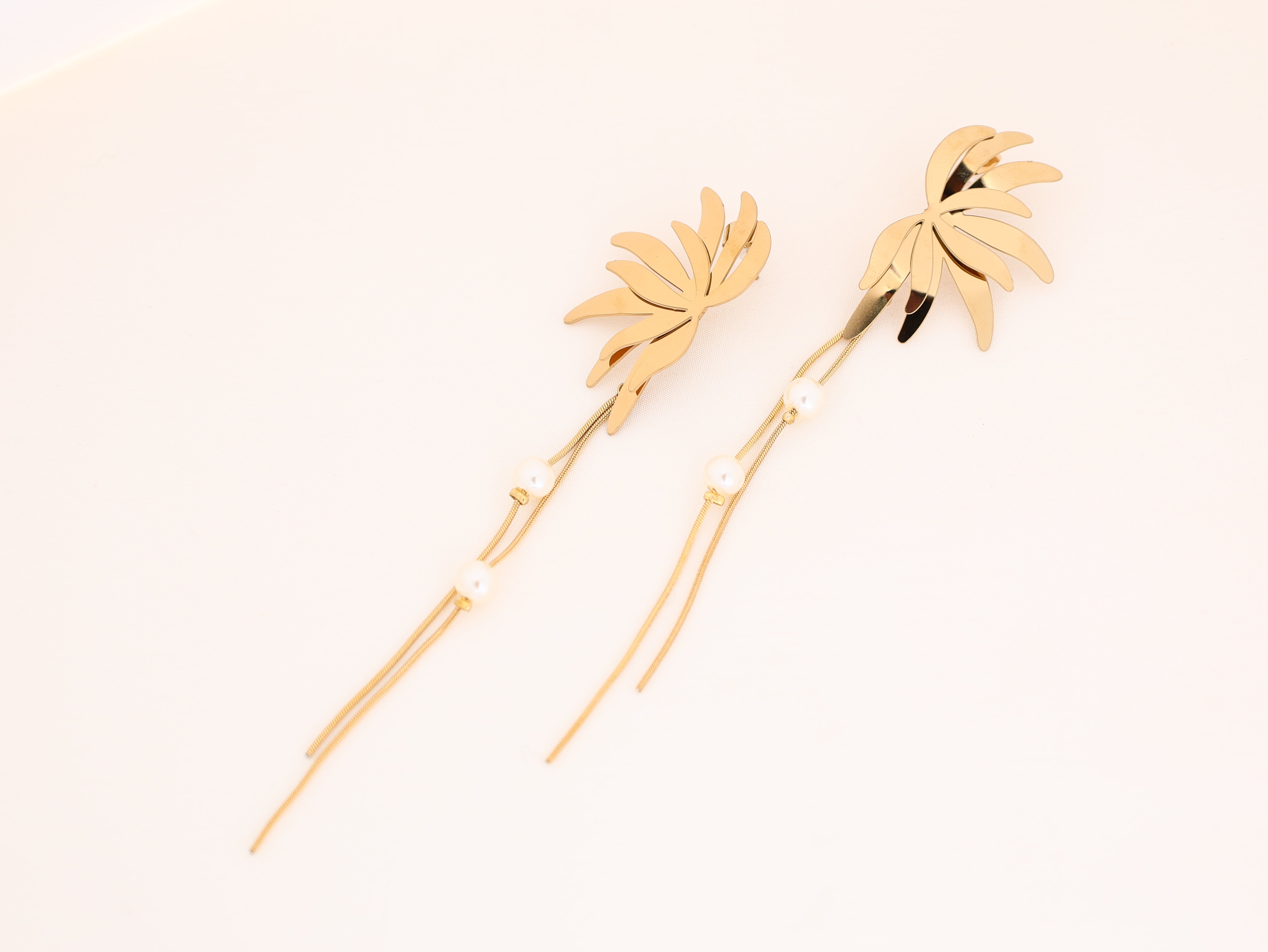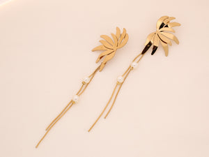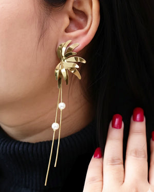 Inspired by sunlit palms, this gold-plated pair showcases layered leaf silhouettes paired with slender dangling chains adorned with minimal pearls.