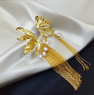 A radiant pair of earrings featuring hammered gold petals with pearl centers and delicate net like chains for an elegant flow. Paired in an uneven yet harmonious design for a chic contemporary look.