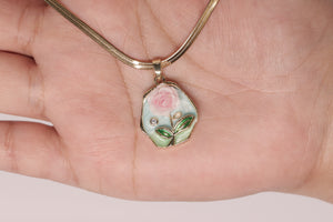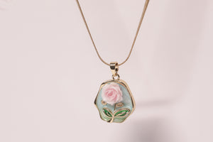 A dainty gold chain cradles a whimsical floral pendant, where a soft pink rose and verdant leaves bloom against a pastel backdrop, exuding feminine charm.