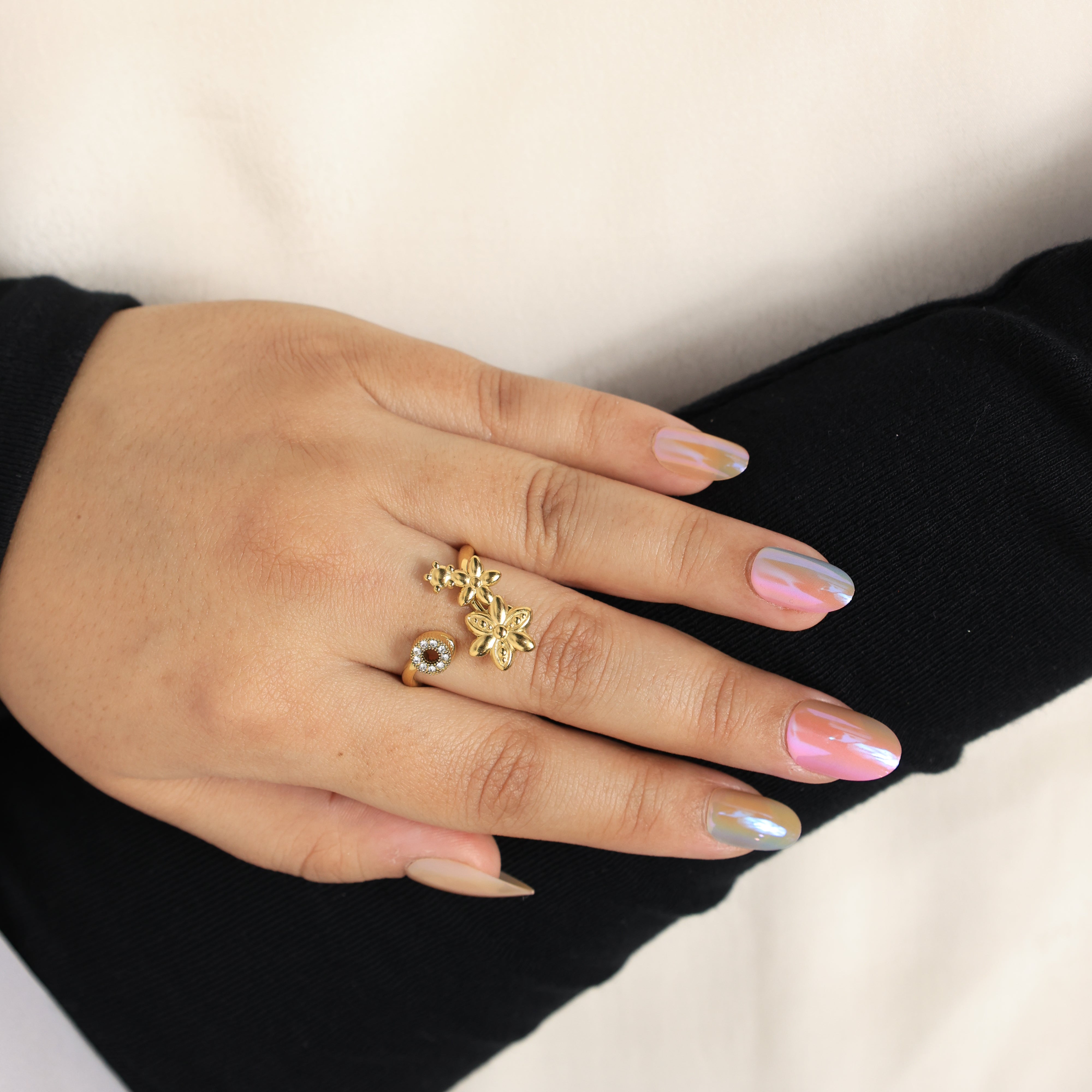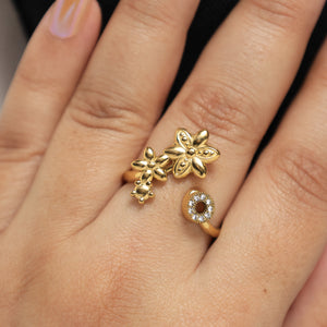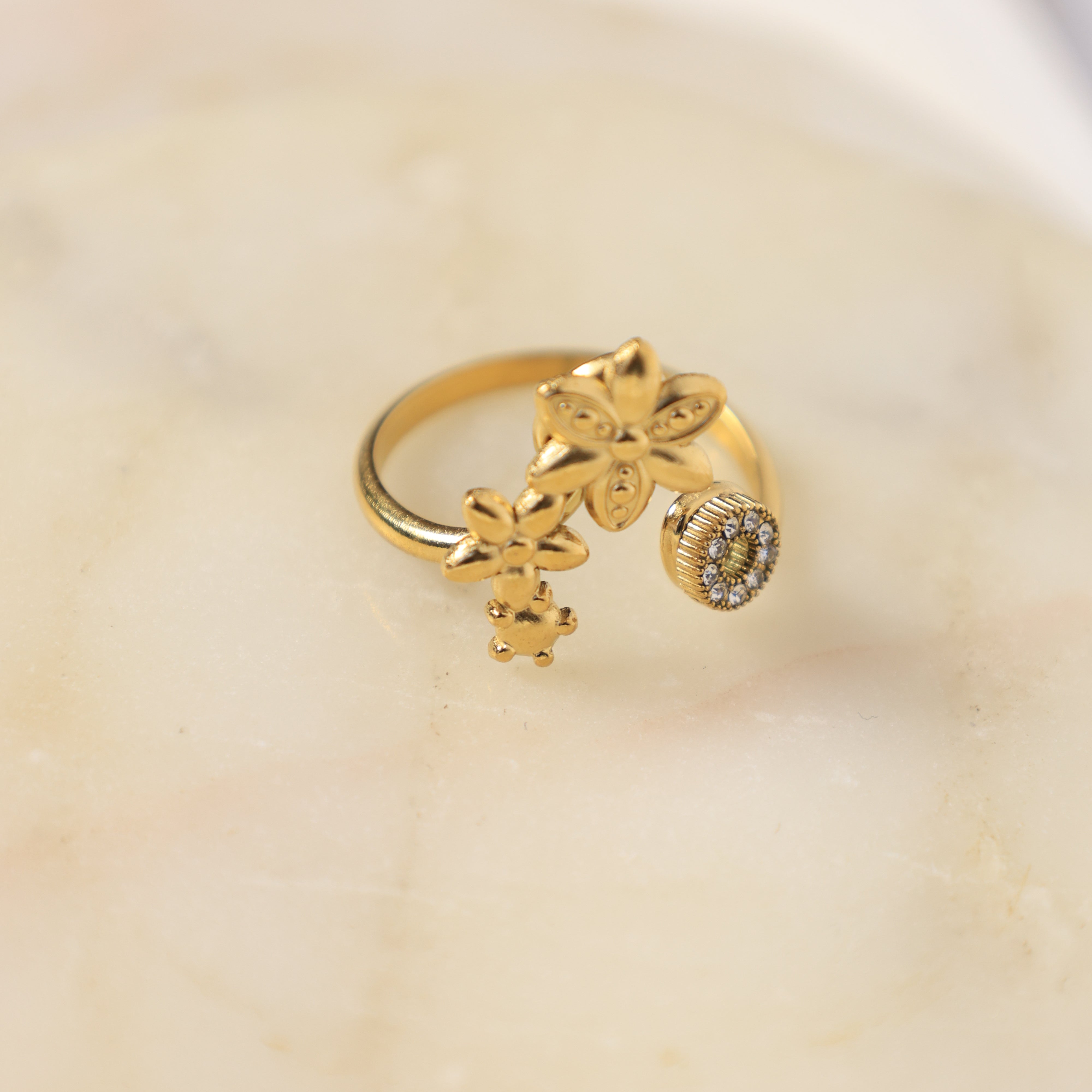 Crafted in gold plating, this adjustable floral ring brings together intricate blooms and a subtle American diamond shine for a charming look.