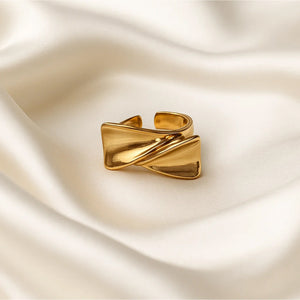 A polished gold band featuring overlapping fold-like edges for a sharp contemporary look.