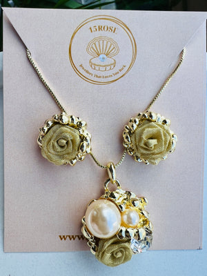 Elegant gold-plated earrings with fabric roses nestled in textured gold frames and accented with American diamond, merging softness with shine.