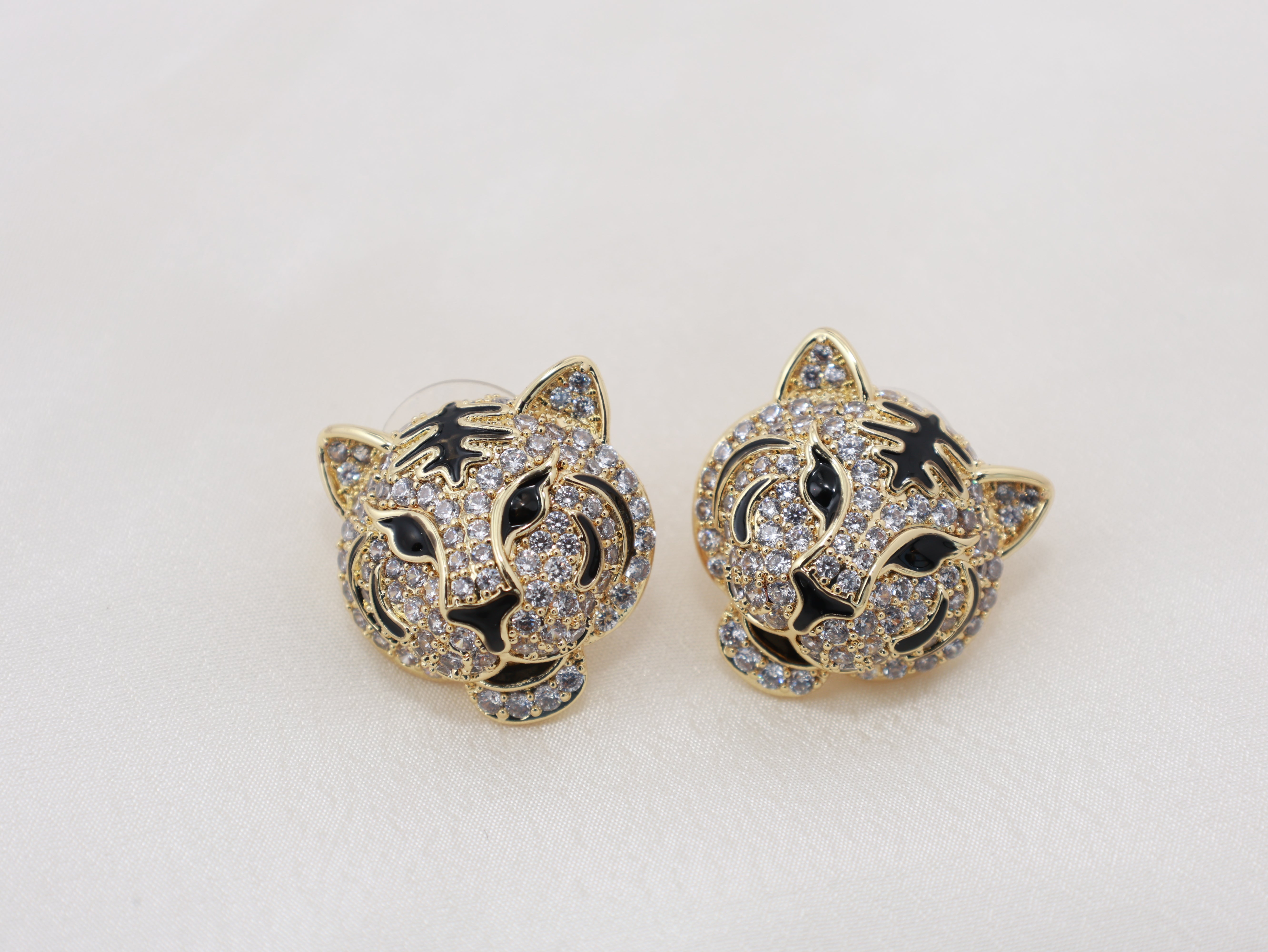 These striking stud earrings are crafted in the shape of a majestic tiger face, finished in a rich gold tone that enhances their bold character. The surface is intricately paved with brilliant moissanite stones, creating a high-shine, diamond-like sparkle. Black enamel accents define the eyes, stripes, and facial contours, adding depth and intensity to the design. Powerful yet refined, these earrings are perfect for those who love statement jewellery with a fierce edge.