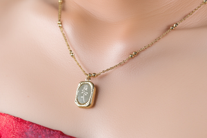 A refined gold necklace with evenly spaced beads, centered by an engraved rose pendant framed in an organic, hammered border.