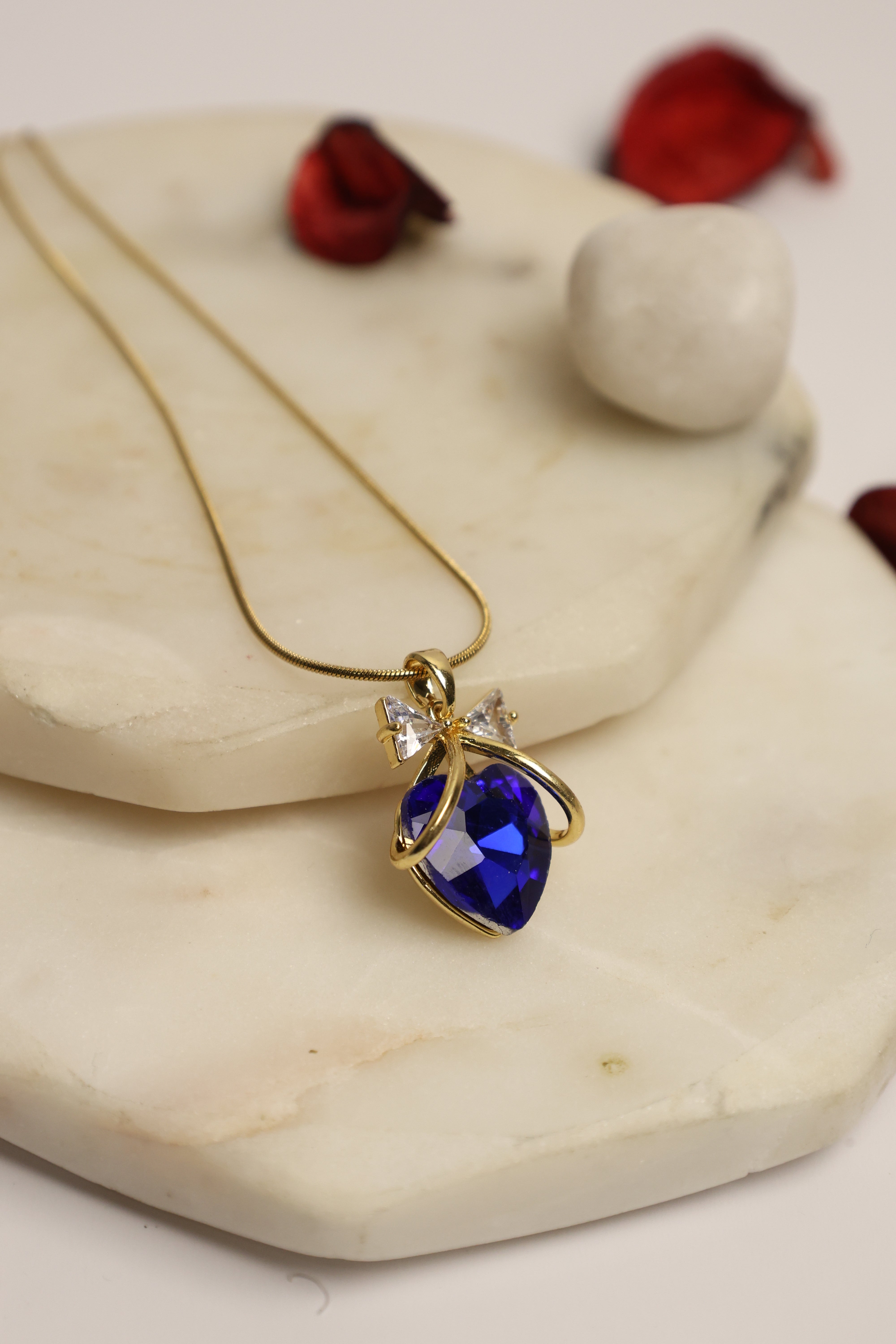 Gold-plated elegance with a striking sapphire-blue heart gemstone, topped with a sparkling bow accent.