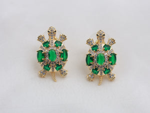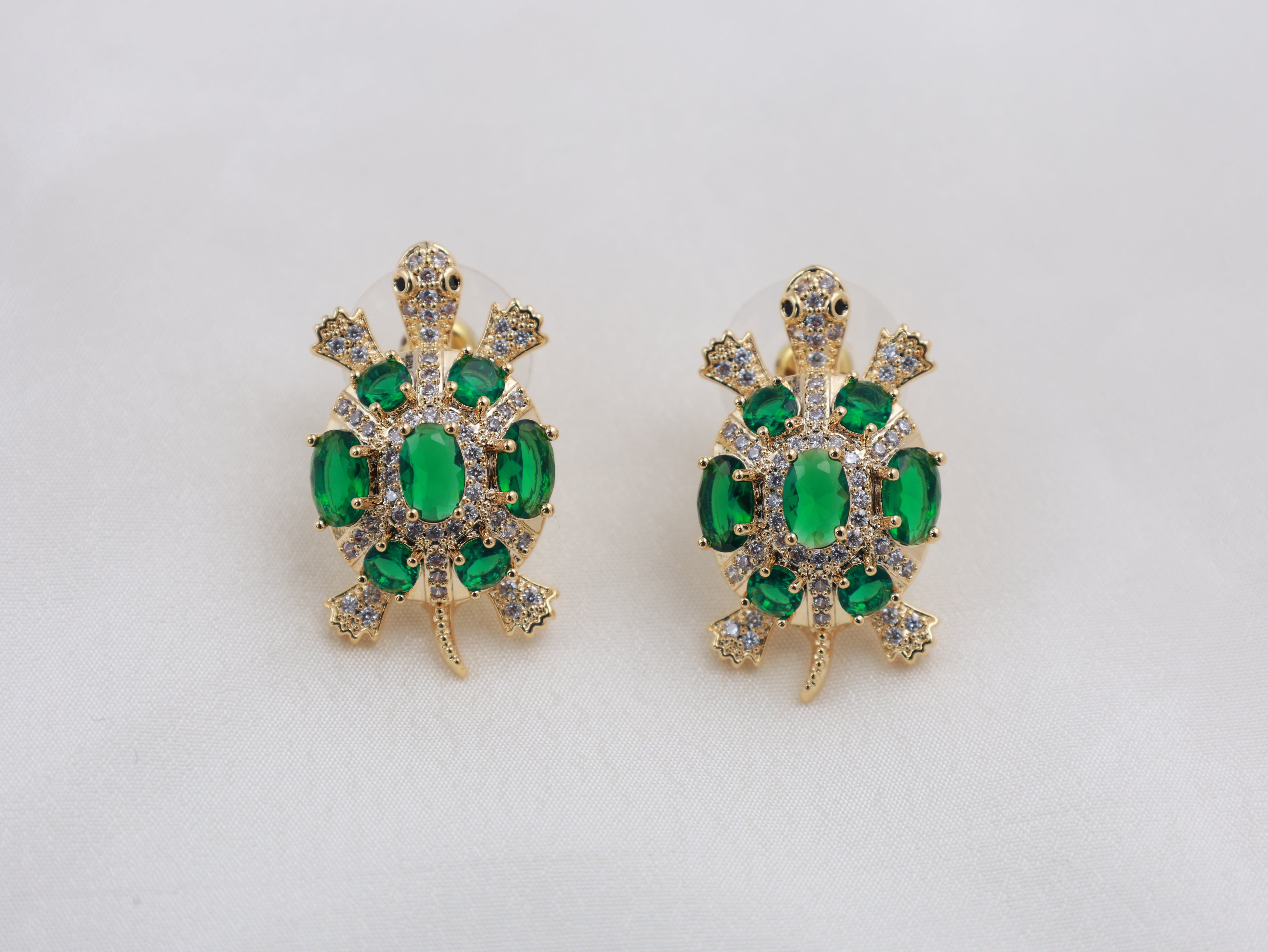 Inspired by the timeless elegance of ocean turtles, this exquisite design features a refined oval turtle silhouette adorned with rich green stones, meticulously arranged to echo the natural symmetry of a sculpted shell. Hand-set moissanite stones trace the contours of the body and limbs, offering exceptional brilliance and a radiant, diamond-like fire from every angle. Finished in a luminous polished gold tone, these earrings balance artistry with opulence—creating a statement that feels rare, refined, and undeniably luxurious.![]()