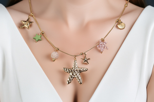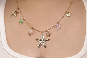 A delicate gold chain decorated with starfish, seashell and pastel charms that bring a coastal fantasy to life