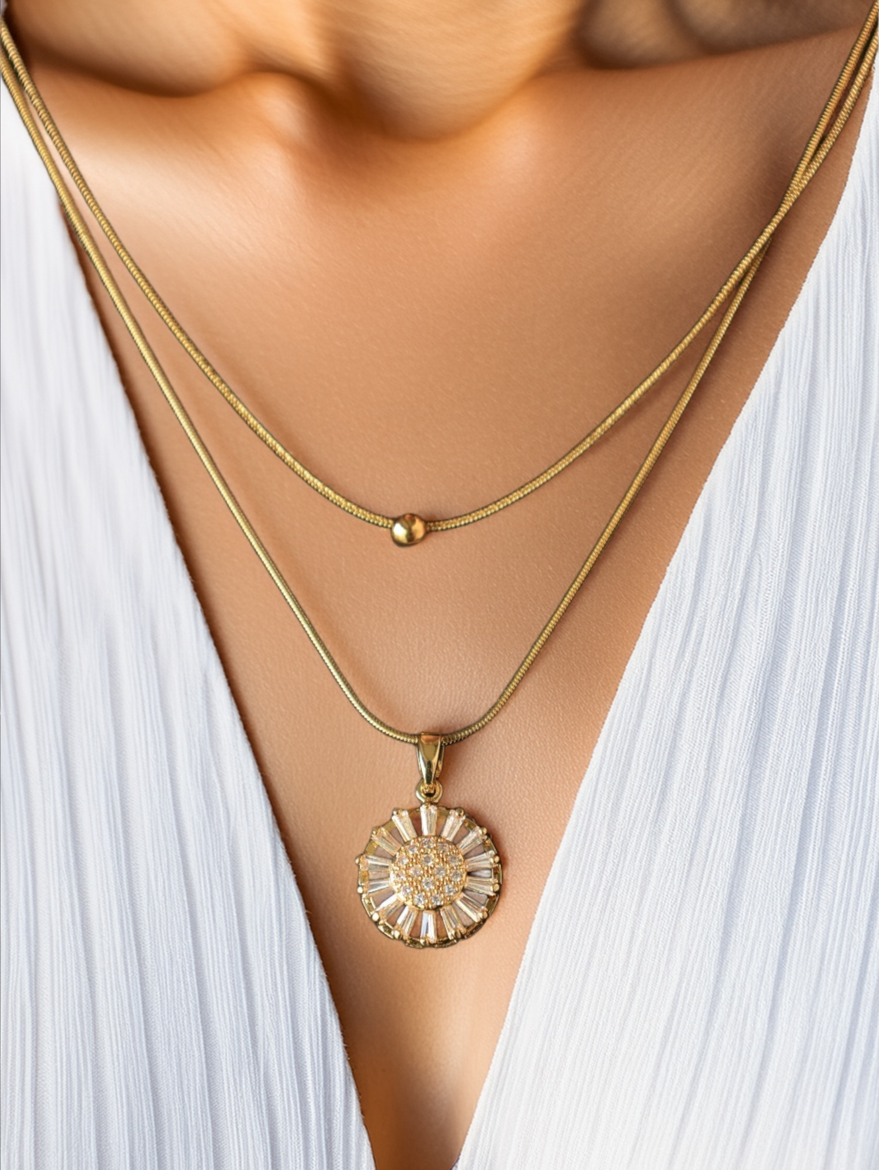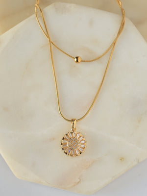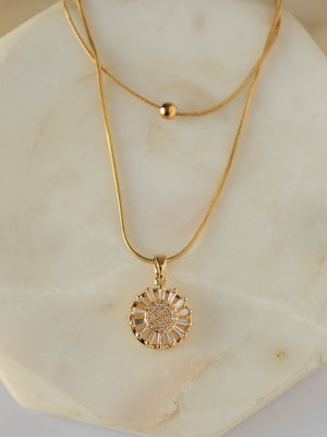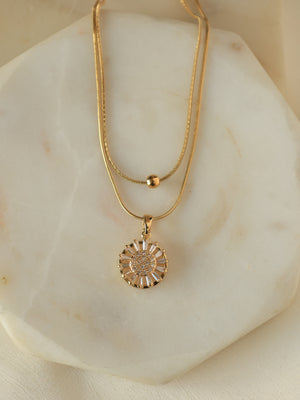 Elegant and radiant, this two-layer gold-plated necklace flaunts a chic upper chain paired with a round floral-inspired pendant encrusted with American diamonds for a graceful, feminine charm.