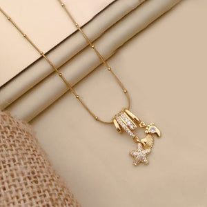 A delicate gold-plated chain enhanced with subtle beads and a dual charm pendant of fish and starfish, adorned with American diamonds.