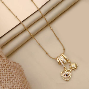 A stunning gold-plated necklace featuring a trio of charms — a sparkling heart, an evil-eye motif, and a radiant sun — symbolising love, protection, and positivity.