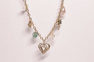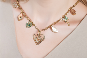 A whimsical gold chain necklace adorned with playful charms—layered hearts, a turquoise rose, palm tree, and pearlescent leaves—capturing the carefree spirit of island daydreams.