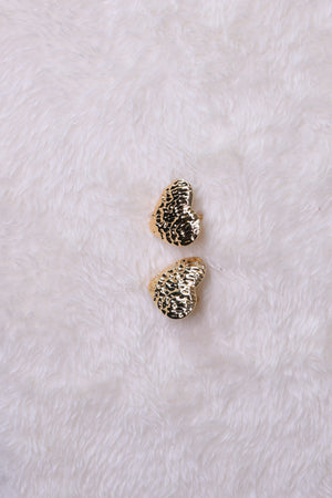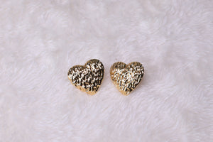 Heart-shaped gold studs with a bold, hammered texture that adds raw charm to a classic romantic design