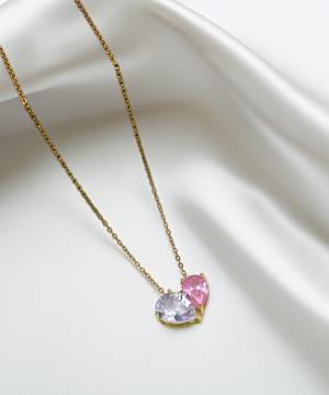 A delicate gold chain necklace with two pear-cut stones in pink and lavender forming a heart-like union.