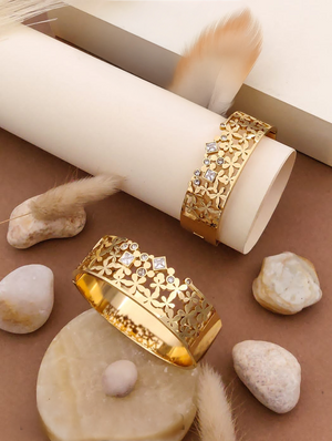 A radiant gold-plated bangle styled bracelet adorned with delicate floral cutwork and shimmering American diamonds for a graceful charm.