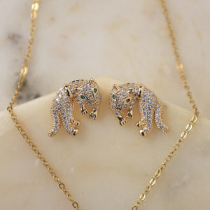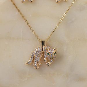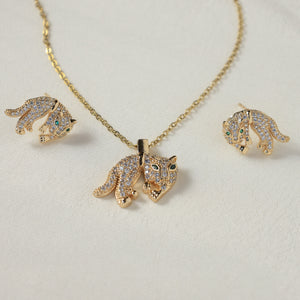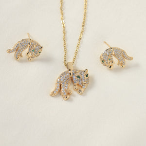 A captivating gold-plated necklace and earring duo showcasing panther-inspired designs encrusted with American diamonds and finished with emerald-green eyes for a bold, sophisticated allure.