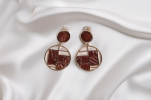 Circular drop earrings with deep plum-toned inlays framed in gold grids, offering a bold yet refined geometric statement